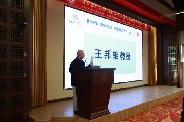 研讨会的第一部分“《日本古代文学发生学研究》新书发布暨开幕式”由北京大学东方文学研究中心主任陈明教授主持。陈明教授简要介绍了严绍璗先生与他的新作《日本古代文学发生学研究》。此后,北京大学东方文学研究中心学术委员会主任、博雅讲席教授王邦维教授在开幕词表达了对严绍璗先生的尊敬和对先生严谨治学态度与谦虚为人的钦佩,并高度肯定了《日本古代文学发生学研究》在东方语言文学学科中的学术价值。
